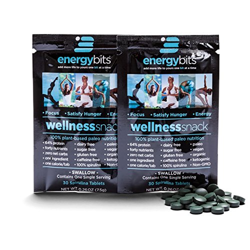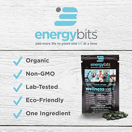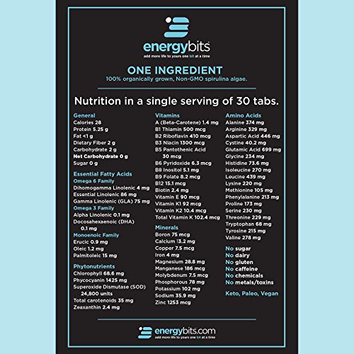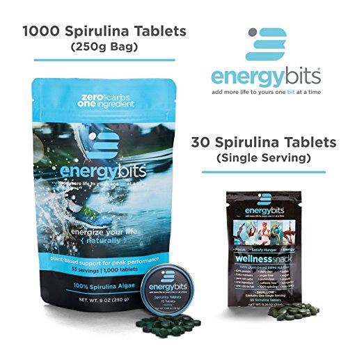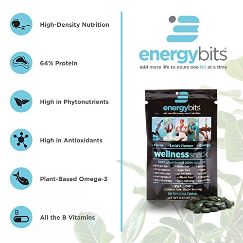 ENERGYBITS – Organic Spirulina Tablets – Plant-Based Algae Superfood – for Focus, Fitness, Energy – Plant Protein – Gluten Free – Collagen, Vitamin B12, Omega 3 – Keto & Vegan – 60 Algae Tablets