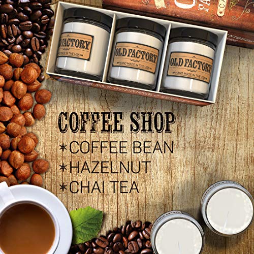 COFFEE SHOP CANDLES. Enjoy the rich, warm scents of your favorite coffee shop right at home, this candle set includes 3 4-ounce candles that will fill your home with the scents of fresh brewed coffee, sweet hazelnut, and spicy chai.